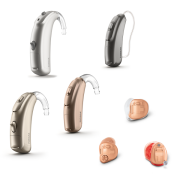 • Behind-the-ear (BTE) – In BTE hearing aids, the complete technology is contained inside a durable case that sits on the back of the outer ear. Sounds are transmitted to the user’s ear directly, via a small tube or through an ear mold. BTE hearing aids have traditionally been the largest, but also the most powerful hearing aids available.